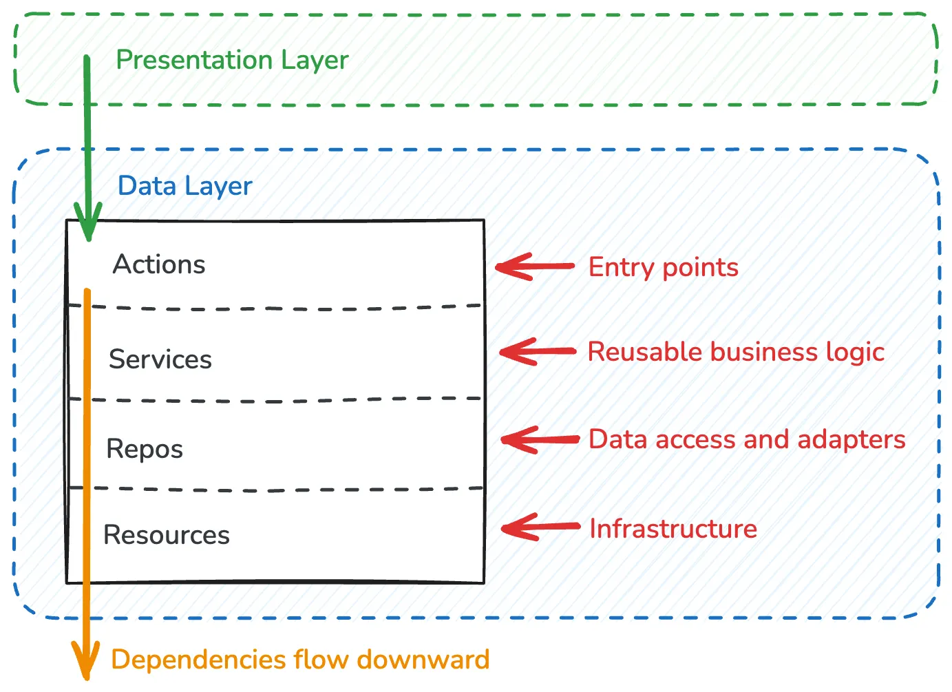 | Actions | Entry points from your framework (routes, server functions, API endpoints). They are aware of the HTTP request, like bodies and response codes. |