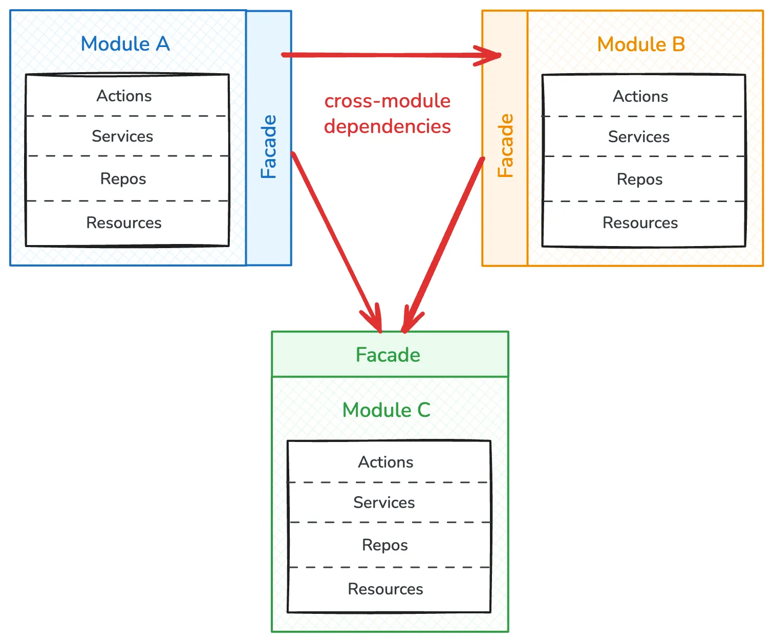// Modules can only access other modules through Facadesclass BillingService extends Billing.Service { users = this.inject(UserFacade) // ✅ Facade from Users module